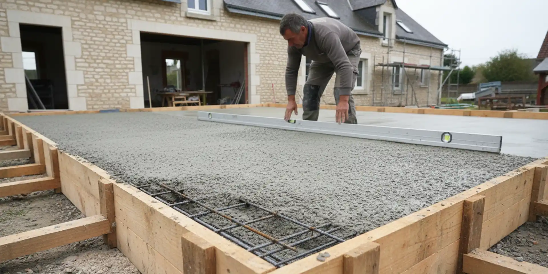 Un ouvrier de la construction lisse le béton humide pour les fondations d'une maison à côté d'un bâtiment, en se concentrant sur la consolidation des fondations, entouré de terre et d'une charpente en bois.