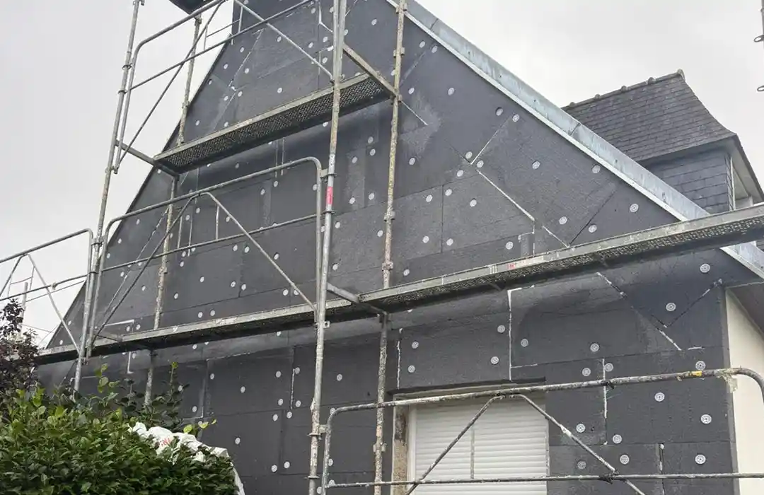 Après préparation des supports et sécurisation du chantier, les panneaux isolants ont été posés sur l’ensemble des façades. Les encadrements de fenêtres, les angles et les soubassements ont fait l’objet d’un traitement spécifique afin d’assurer la continuité thermique. Cette intervention s’inscrit dans une démarche d’isolation thermique par l’extérieur performante, visant à supprimer les ponts thermiques et à améliorer l’inertie globale du bâtiment.