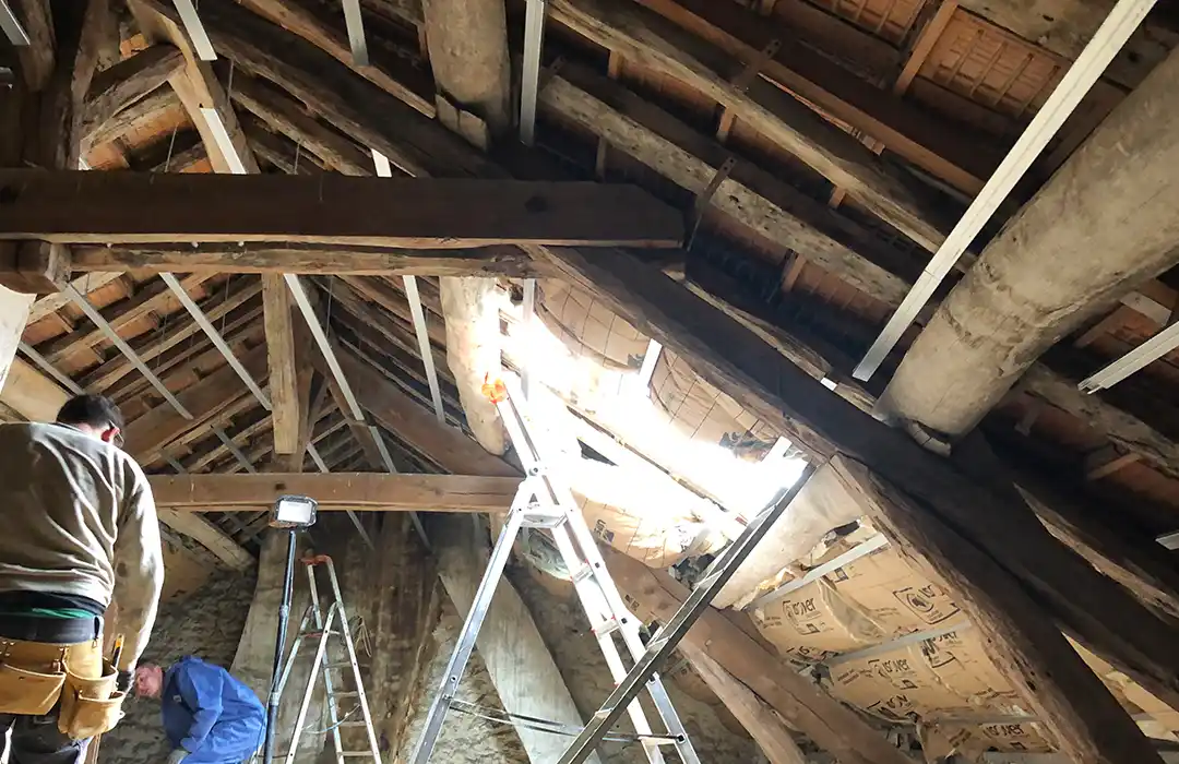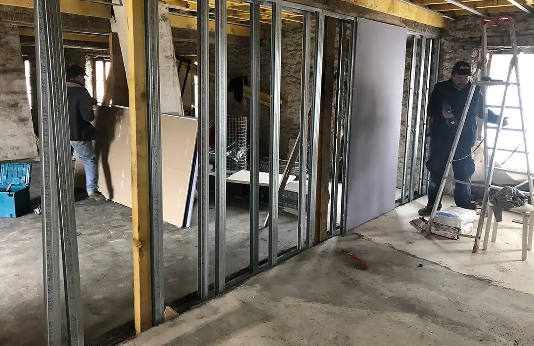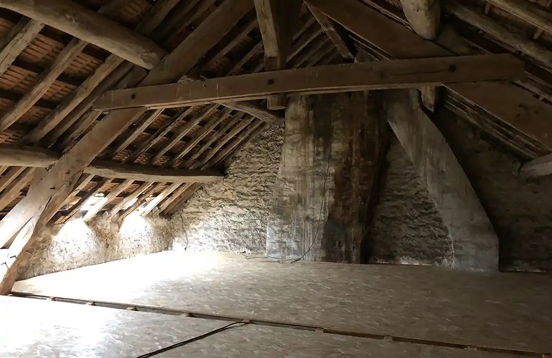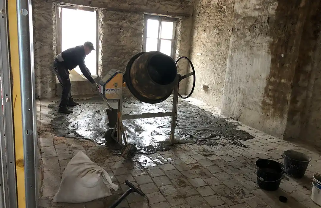 La première étape a consisté à reprendre la structure porteuse. Les anciens planchers ont été déposés puis reconstruits afin d’assurer la stabilité et la portance nécessaires à un usage résidentiel. Cette phase s’inscrit pleinement dans notre expertise en travaux de maçonnerie générale en Essonne, notamment lorsqu’il s’agit de réhabiliter un immeuble ancien en centre-ville.