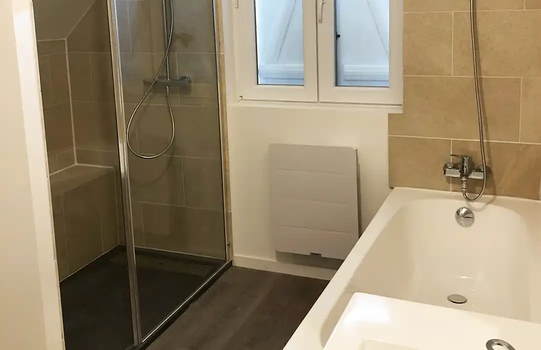 Ce type de chantier relève d’une rénovation intérieure complète avec coordination des corps d’état, incluant électricité, revêtements, sanitaires et finitions.